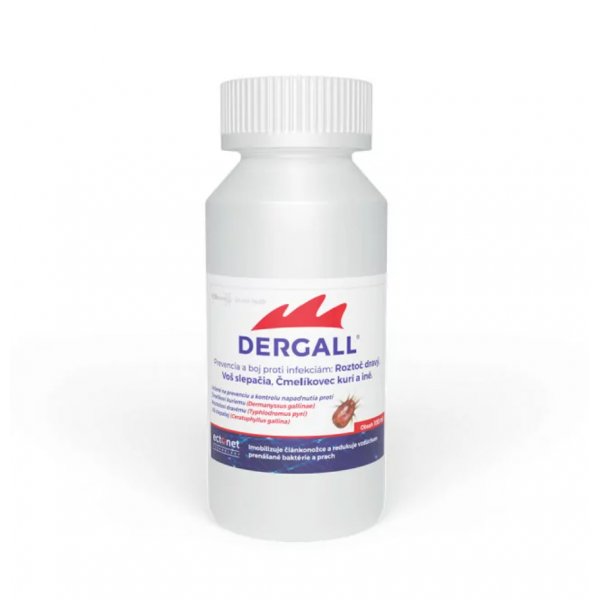 DERGALL patentovaný prípravok vo forme postreku v koncentrácii 0,6 % na ochranu sliepok, vtákov,hadov pred ektoparazitami - škodcami: voš kuracia, kieštikovec kurí, roztoč dravý, pleseň hlavičková, potemník stajňový a iné v chovoch.