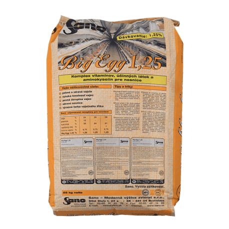 Big Egg 1,25®– prémiová doplnková kŕmna zmes pre nosnice, ktorá podporuje vysokú znášku, pevnú škrupinu a intenzívnu farbu žĺtka. Obsahuje fytázu, vitamín E, selén a biotín pre zdravie, imunitu a lesklé operenie. Zabezpečuje optimálne využitie živín a dlhodobú produktivitu sliepok.