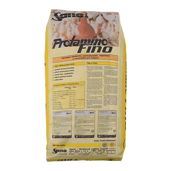 Protamino Fino® je vysokokvalitný bielkovinový koncentrát navrhnutý pre záverečné obdobie odchovu brojlerov, kačiek a husí. Obsahuje až 41 % bielkoviny, výlučne sójovú múčku, bohatý vitamínový komplex a fitázu pre lepšie využitie fosforu. Zaručuje zdravý rast, nízke náklady na chov a vyššiu mieru zisku.
